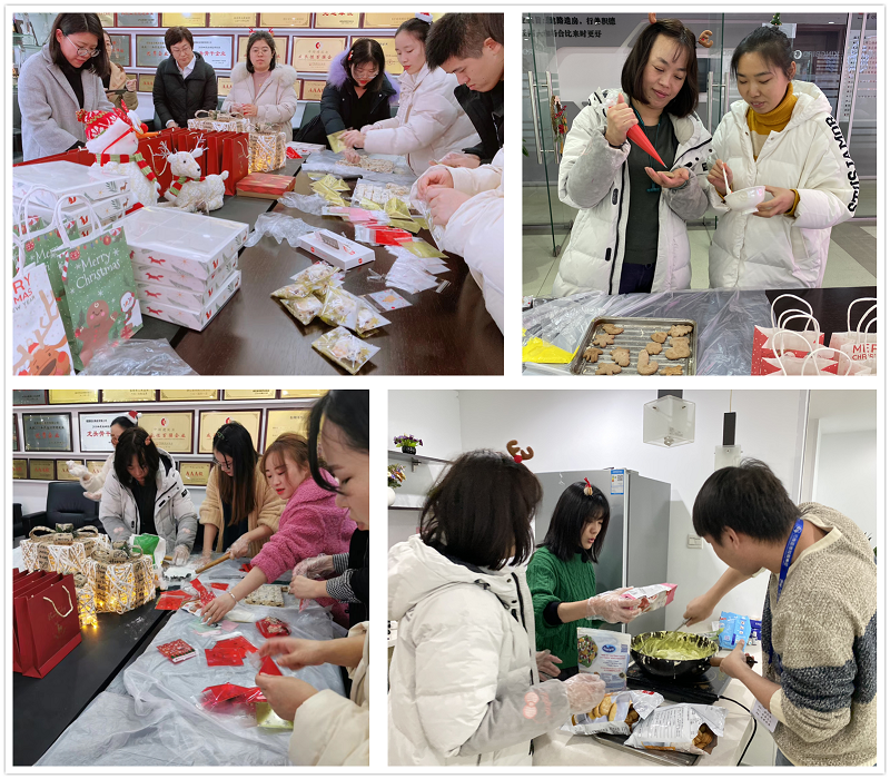天冷的时候更喜欢软绵绵和甜甜的东西——职能部门员工聚在一起,一起制作雪花酥还有圣诞专属的小姜饼。烤箱中形状别致的姜饼一点点膨胀;棉花糖慢慢融化,在搅拌下像云朵一般裹住饼干和坚果……把一下午的成果包成礼盒,让圣诞老人传递给辛勤了一年的同事们,用甜蜜代表祝福。